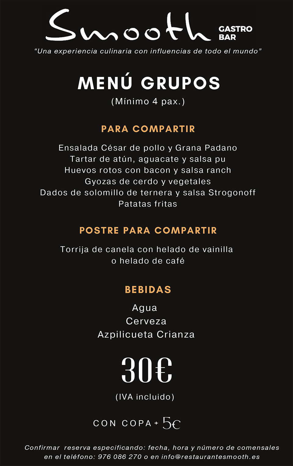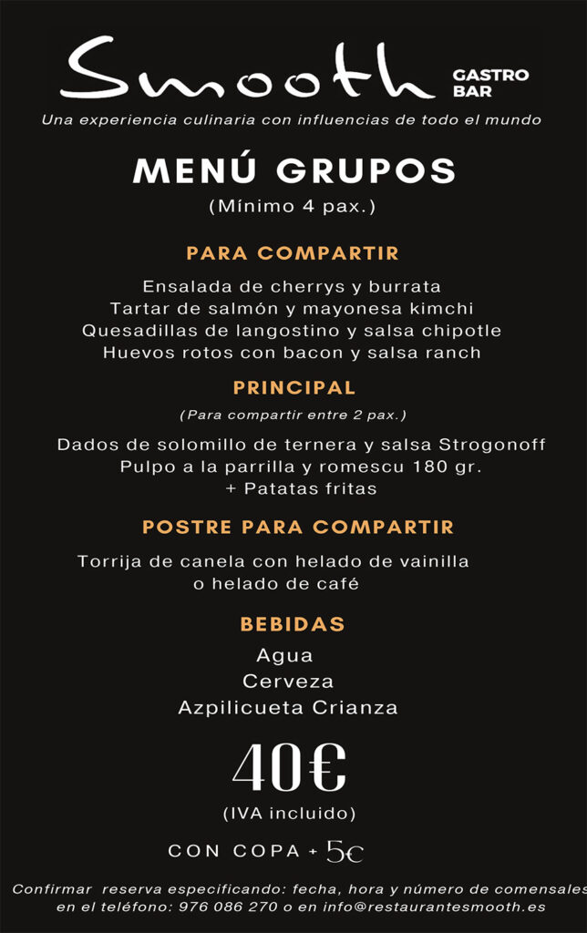 Descubre nuestros menús personalizados para grupos * Reserva mínima para 4 personas Para reservas de más de 8 personas llama al 976 086 270 o escríbenos a info@restaurantesmooth.es Haz tu reserva de grupo Descubre nuestros menús personalizados para grupos * Reserva mínima para 4 personas Para reservas de más de 8 personas llama al 976 086 270 o escríbenos a info@restaurantesmooth.es Haz tu reserva de grupo